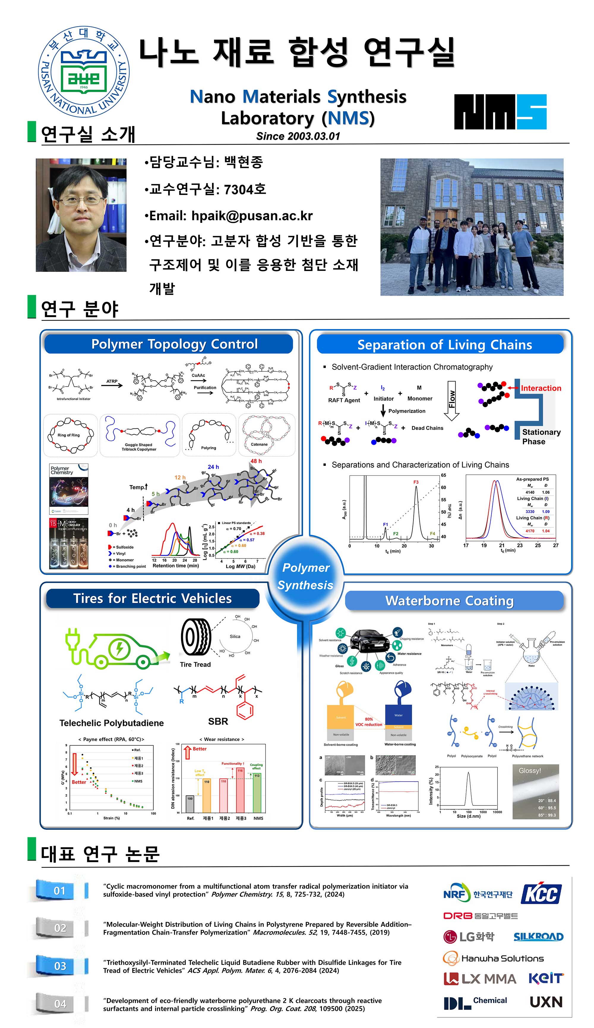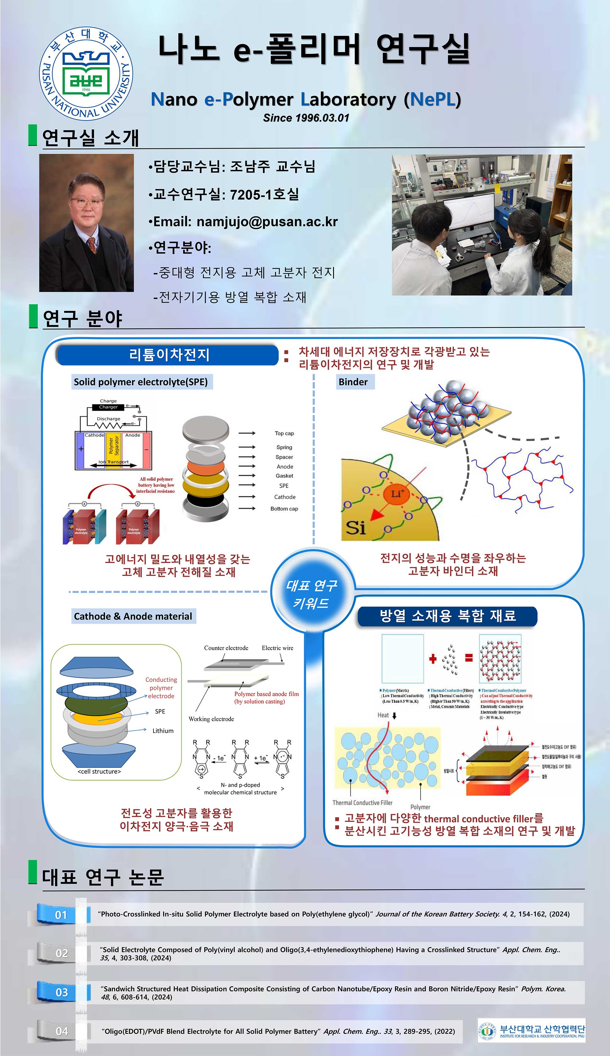 | 나노e폴리머연구실 | 조남주 | 051-510-3207 | 제7공학관 7109호실 | 연구실 바로가기 | |
